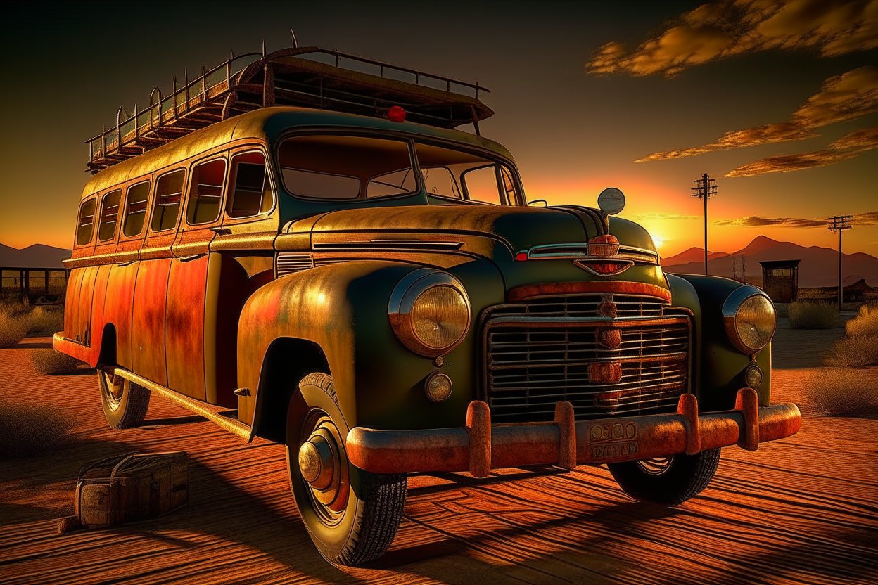 Prompt yang saya pakai adalah : 1952 GMC Suburban Carry All Wagon, long chasis, classic, Steam punk, Salvador Dali, Hyperrealistic, Unreal engine, Front light, Uplight, Wide-Angle Shot, Leica, Golden hour, Symmetrical, ISO800, Full HD --q 2 --ar 16:9 --v 2